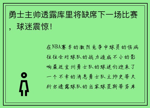勇士主帅透露库里将缺席下一场比赛,球迷震惊!